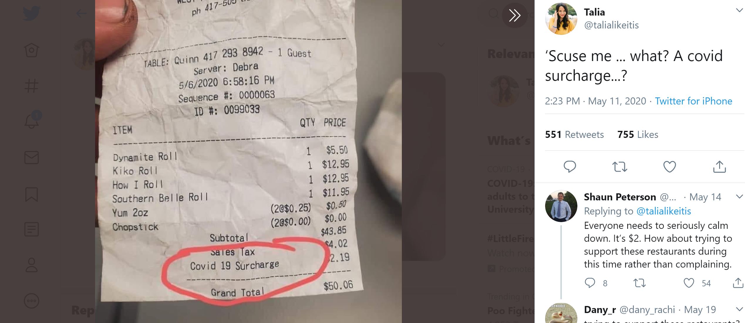 A user on Twitter posted a photo of a receipt from a restaurant and she seemed to take issue with the $2.19 “COVID Surcharge”