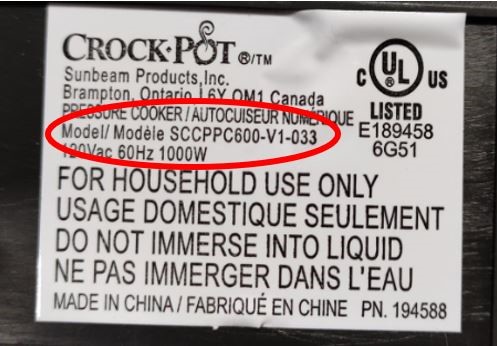 The affected Crock Pots have model numbers: SCCPPC600-V1 and SCCPPC600-V1-033 which can be found on the label situated at the bottom of the unit.