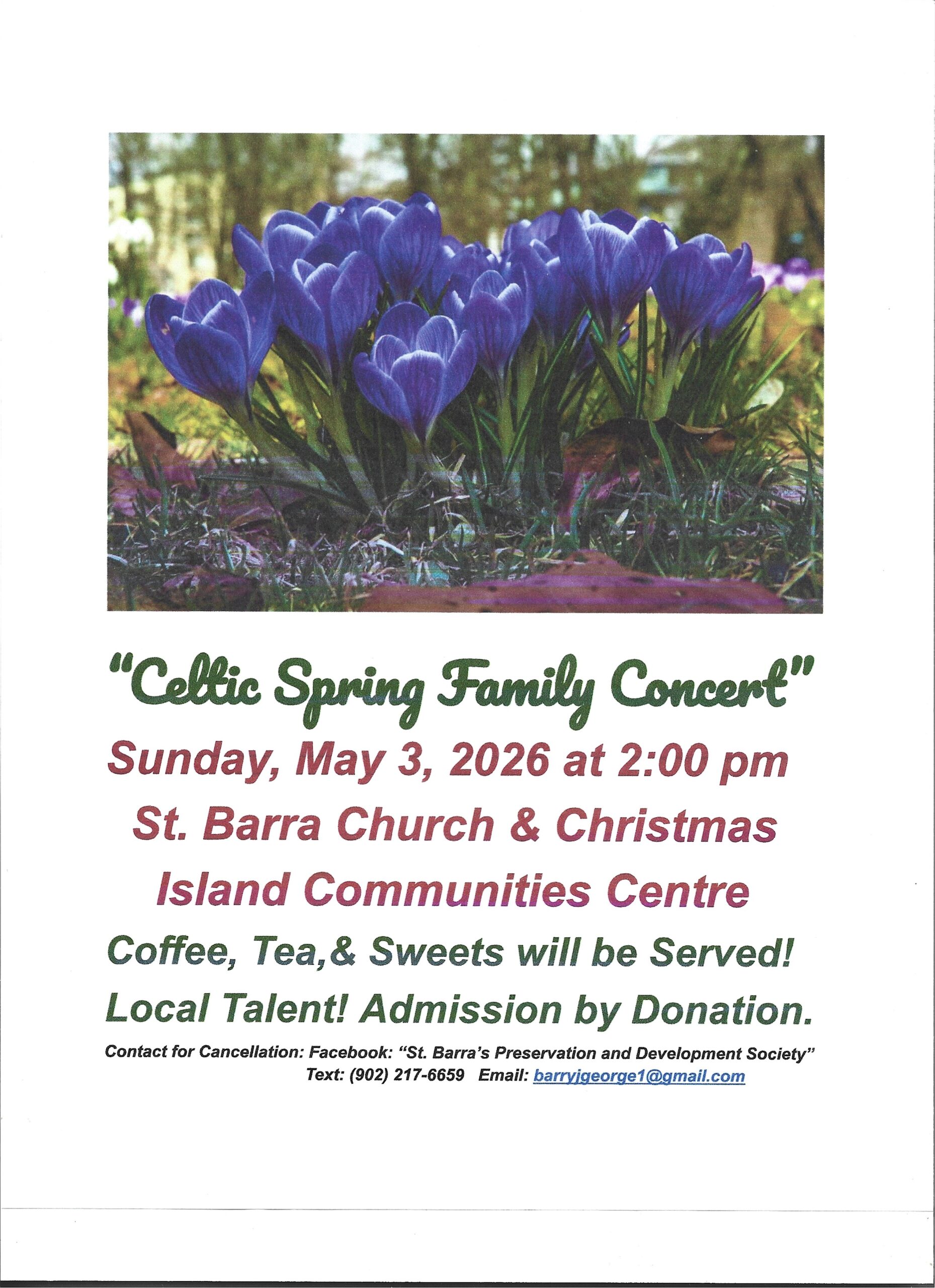 “Celtic Spring Family Concert” for Gaelic Awareness Month, May 3, 2026 featuring Local Talent at St. Barra Church & Christmas Island Communities Centre at 47 Church Road, Christmas Island, NS starting at 2 pm. Coffee, tea, & sweets will be served! Admission by Donation! Sponsored by: The Wardens of the Church of St. Barra Preservation and Development Society. Facebook: St. Barra’s Preservation and Development Society. Text: (902) 217-6659. Email: barryjgeorge1@gmail.com
