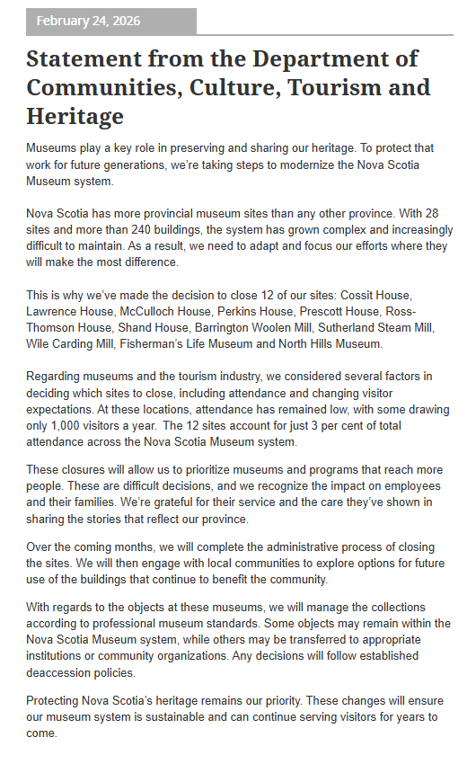 Last week we learned that the provincial government plans to shut down several visitor information centres and a number of museums across Nova Scotia. What you might not know is that another announcement was released yesterday outlining even more museum closures that will impact communities throughout the province.