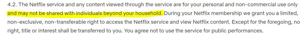According to the Netflix Terms of Service (which we all read, I’m sure wink wink) The Netflix service and any content viewed through the service are for your personal and non-commercial use only and may not be shared with individuals beyond your household. During your Netflix membership we grant you a limited, non-exclusive, non-transferable right to access the Netflix service and view Netflix content.